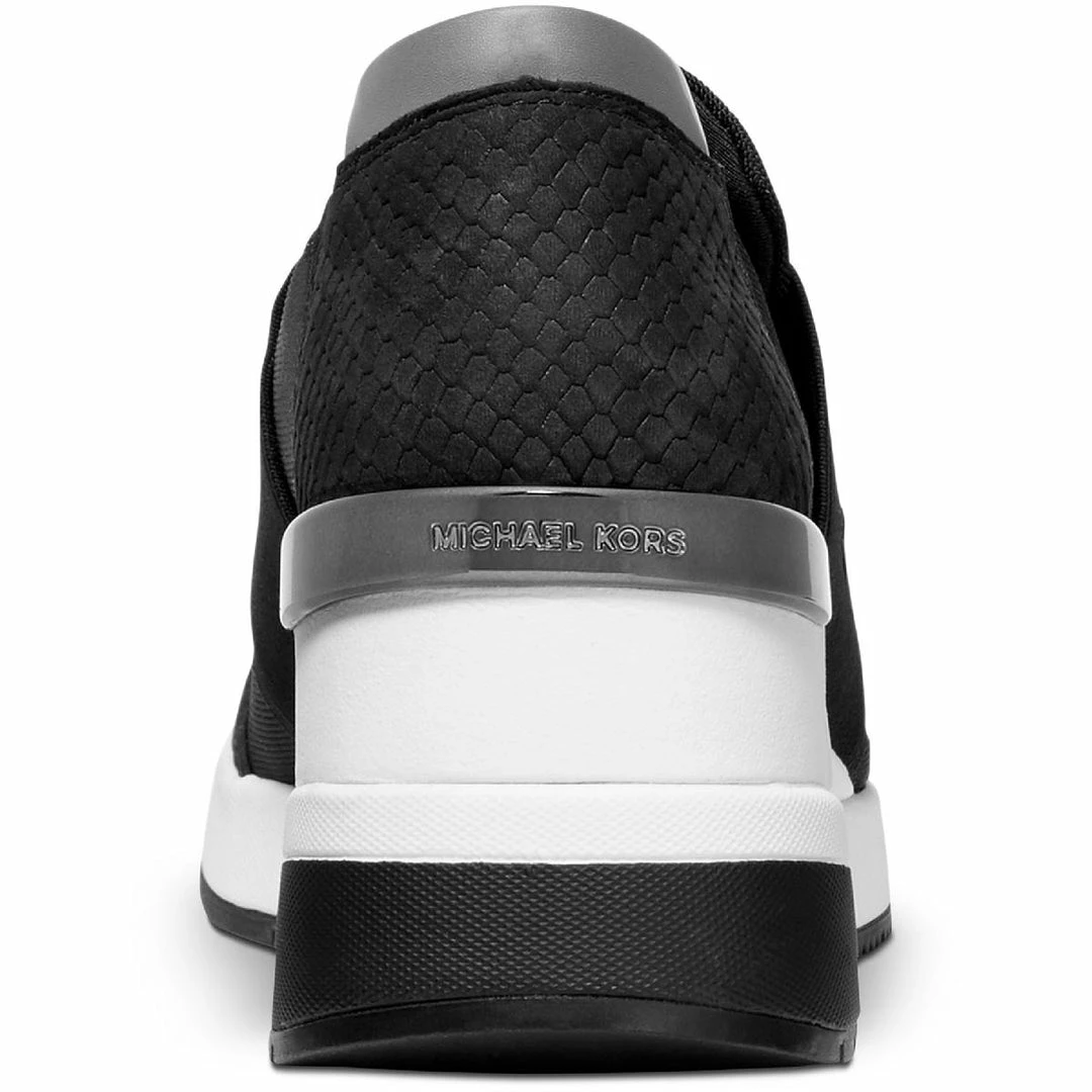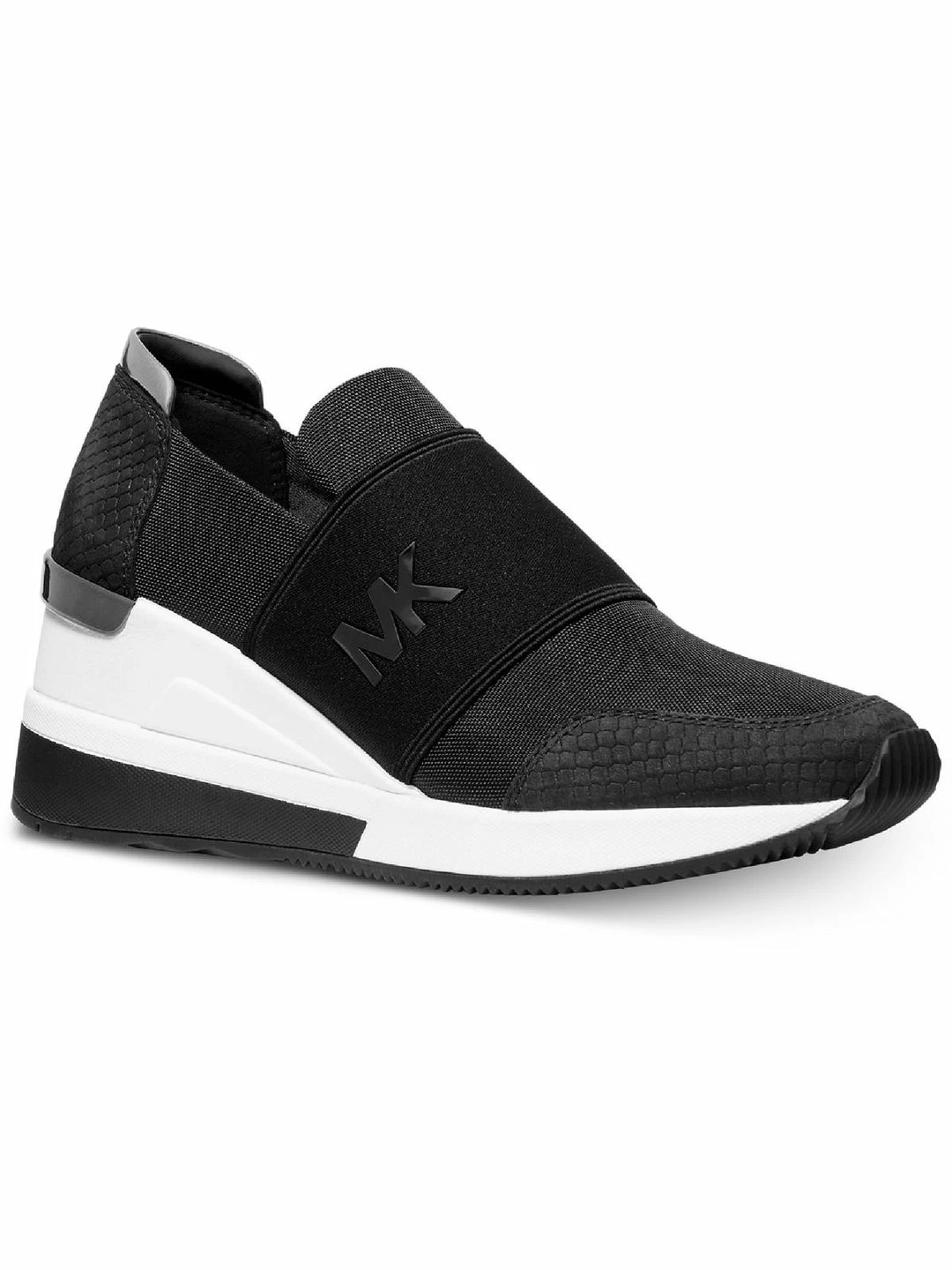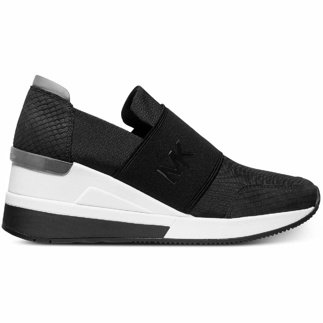 Reach your fitness goal with ease with this Felix sneakers by Michael Kors. Made of canvas uppers with leather trim. Features logo-accented vamp and snake-embossed nubuck trim, providing sporty sophistication. Slip on design for easy on the go wear. Rubber non-slip outsoles.